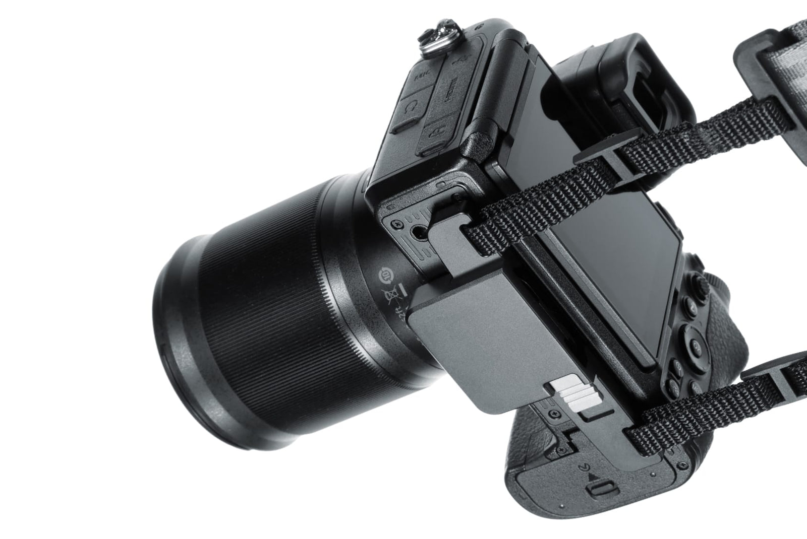 Features: detachable with magnetic closure /// including 38 x 38 mm quicklease plate /// compatible with Arca® and Peak Design® standard plate (V3) /// 1/4"-20 mounting screw /// no disruption of tilt-swivel displays /// Instant battery access /// Specifications: overall length: 107 mm (4.2") /// overall width: 38 mm (1.5") /// weight: 60 gram (2.1 oz) /// CNC-machined aluminum