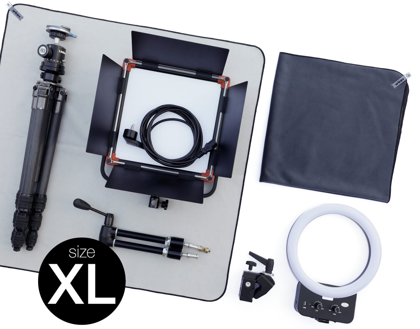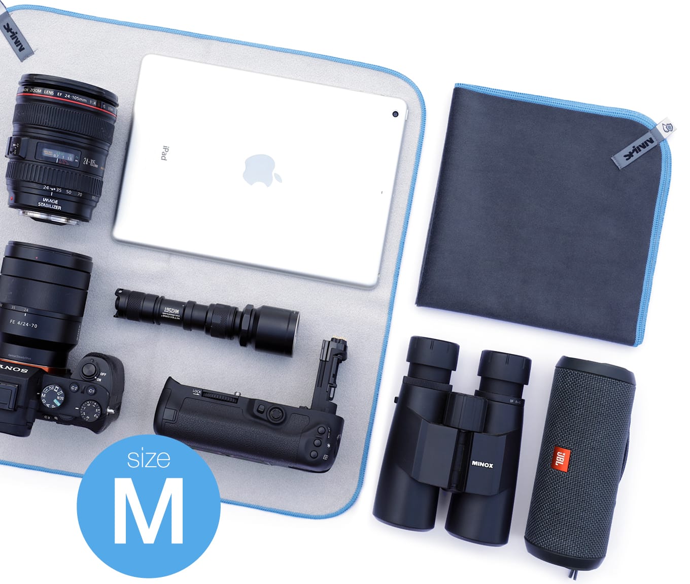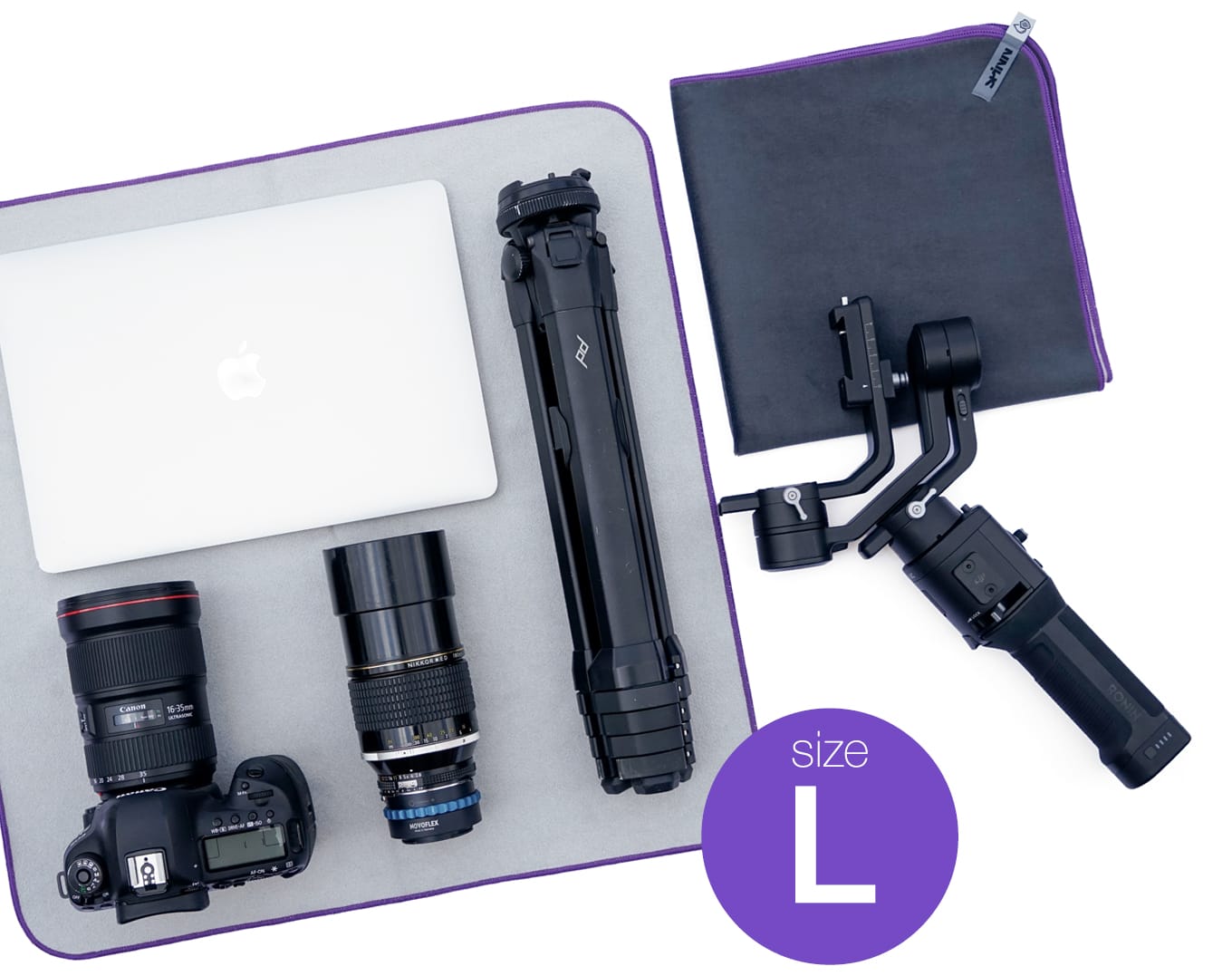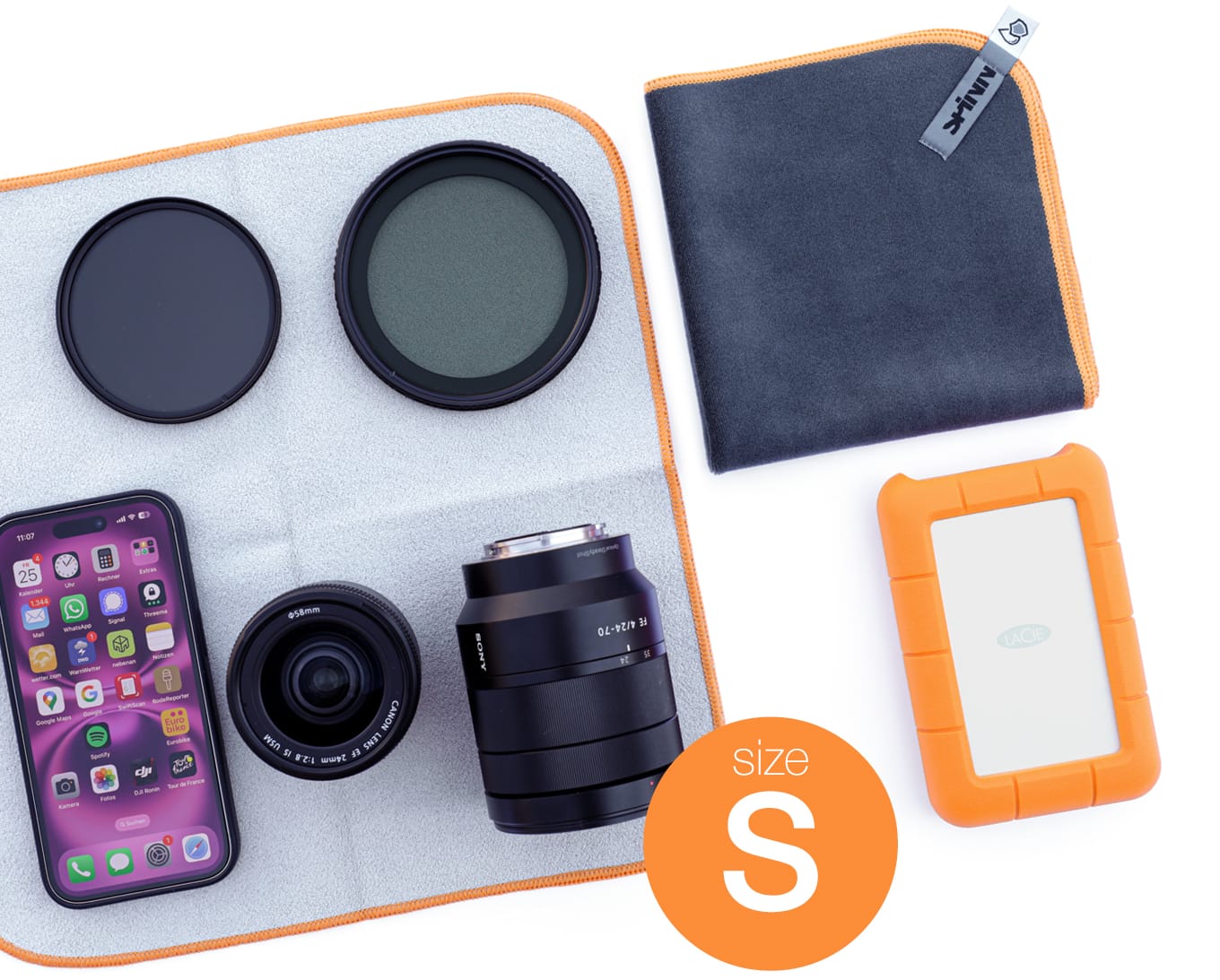 Size S fits for camera lenses up to 80mm diameter and 130mm length, filters, cell phones, glasses, hard drives, USB-cables and chargers. Size M is a real workhorse – it fits well for mirrorless cameras with 24-100 lenses, single lenses up to 100mm diameter and 230mm length, tablets up to 12", boom boxes and binoculars. Size L fits perfectly for DSLRs with 24-105 lenses and larger, single lenses up to 120mm diameter and 340mm length, tripods up to 400mmx90mm and 13"–16" notebooks. Size XL is ideal for large tele lenses, lighting equipment, large tripods and pro-studio accessories.